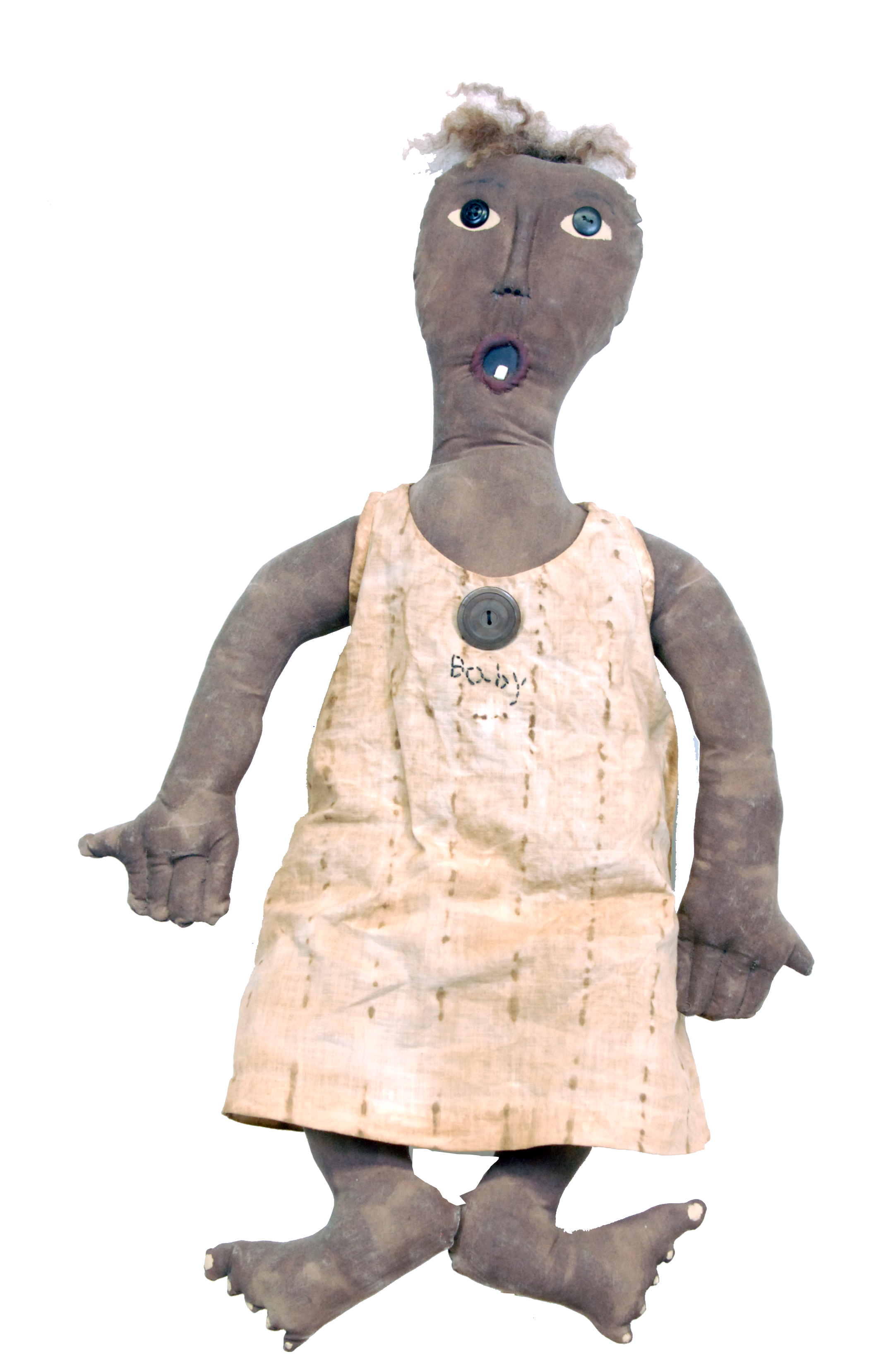 Known as the “Peggy Loving Doll”, this doll was handmade and decorated by Mildred Jeter Loving of fame for her and husband Richard Loving’s landmark victory decision in the 1967 US Supreme Court, Loving v Virginia. With a whimsical, folk art style construction and craftsmanship, the hair on the doll is clearly human and likely was selected for its decoration from Peggy’s own hair.